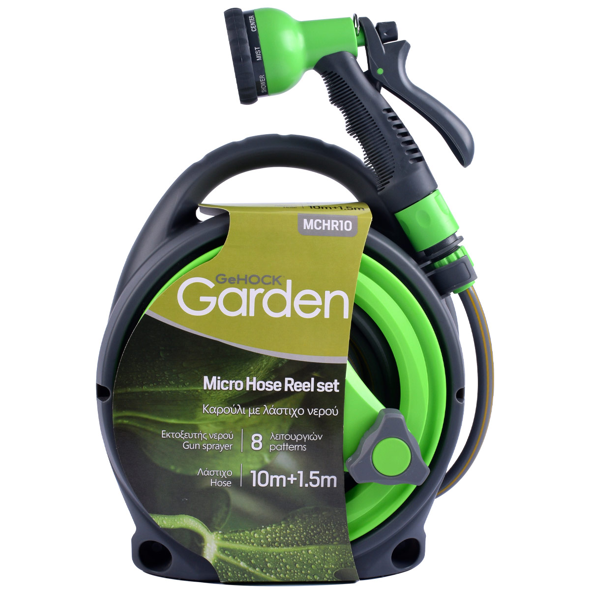 Περιεχόμενα συσκευασίας1 τεμ. μίνι βάση περιτύλιξης λάστιχου 1 τεμ. λάστιχο κήπου 10+1.5m 1 τεμ. πιστόλι ψεκασμού με 8 λειτουργίες 3 τεμ. σύνδεσμοι