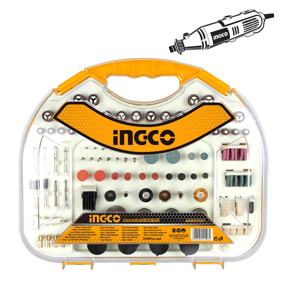 Περιεχόμενα συσκευασίας76 τεμ Δισκάκια κοπής 60 τεμ Γυαλόχαρτα 1 τεμ Τροχός λείανσης 10 τεμ Τροχοί λείανσης με άξονα 4 τεμ Τροχοί γυαλίσματος ελαστικοί 5 τεμ Δίσκοι τσόχας 1 τεμ Μύτη τσόχας 1 τεμ Υφασμάτινος δίσκος 39 τεμ Ταινίες γυαλόχαρτου 6 τεμ Βούρτσες 7 τεμ Μύτες διαμαντιού 2 τεμ Μύτες σκαλίσματος 4 τεμ Οδηγοί εξαρτημάτων 6 τεμ Τρυπανάκια 2 τεμ Άξονες γυαλόχαρτου 4 τεμ Τσοκάκια 1 τεμ Δίσκος λείανσης φίμπερ 1 τεμ Κλειδί 1 τεμ Πέτρα 2 τεμ Αλοιφές γυαλίσματος 12 τεμ Δίσκοι τροχίσματος 5 τεμ Σμυριδόδισκοι κοπής Πλαστική βαλίτσα