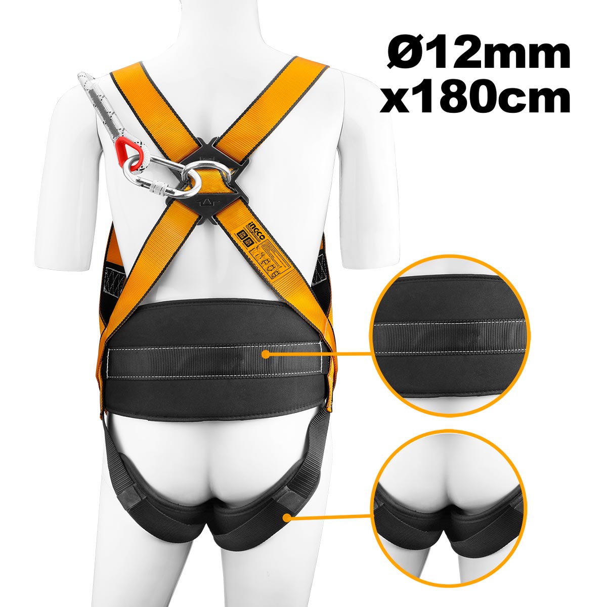 Λεπτομέρειες προϊόντος3 σημεία προσάρτησης, 4 σημεία ρύθμισης, Προσαρμόζονται στο στήθος, στη μέση και στους μηρούς κάθε χρήστη. Επενδυμένη ζώνη μέσης και ιμάντας μηρού. Ανατομικό πάνελ πλάτης με D-Ring. Ρυθμιζόμενο λουράκι στο στήθος. Φάρδος ιμάντων 50mm. Μέγεθος σχοινιού Φ12mm x 1.8m.