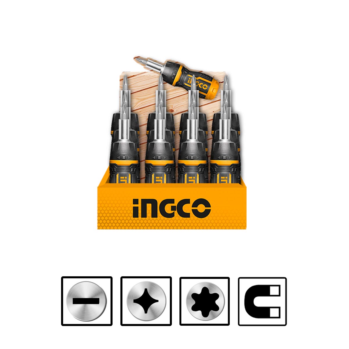 Περιεχόμενα συσκευασίας1 τεμ. Λαβή καστάνιας (με αποθηκευτικό χώρο μέσα). 7 τεμ. Μύτες 25mm: SL5, SL6, PH0, PH1, PH2, T10, T20. (Το Stand περιέχει 12τεμ.)
