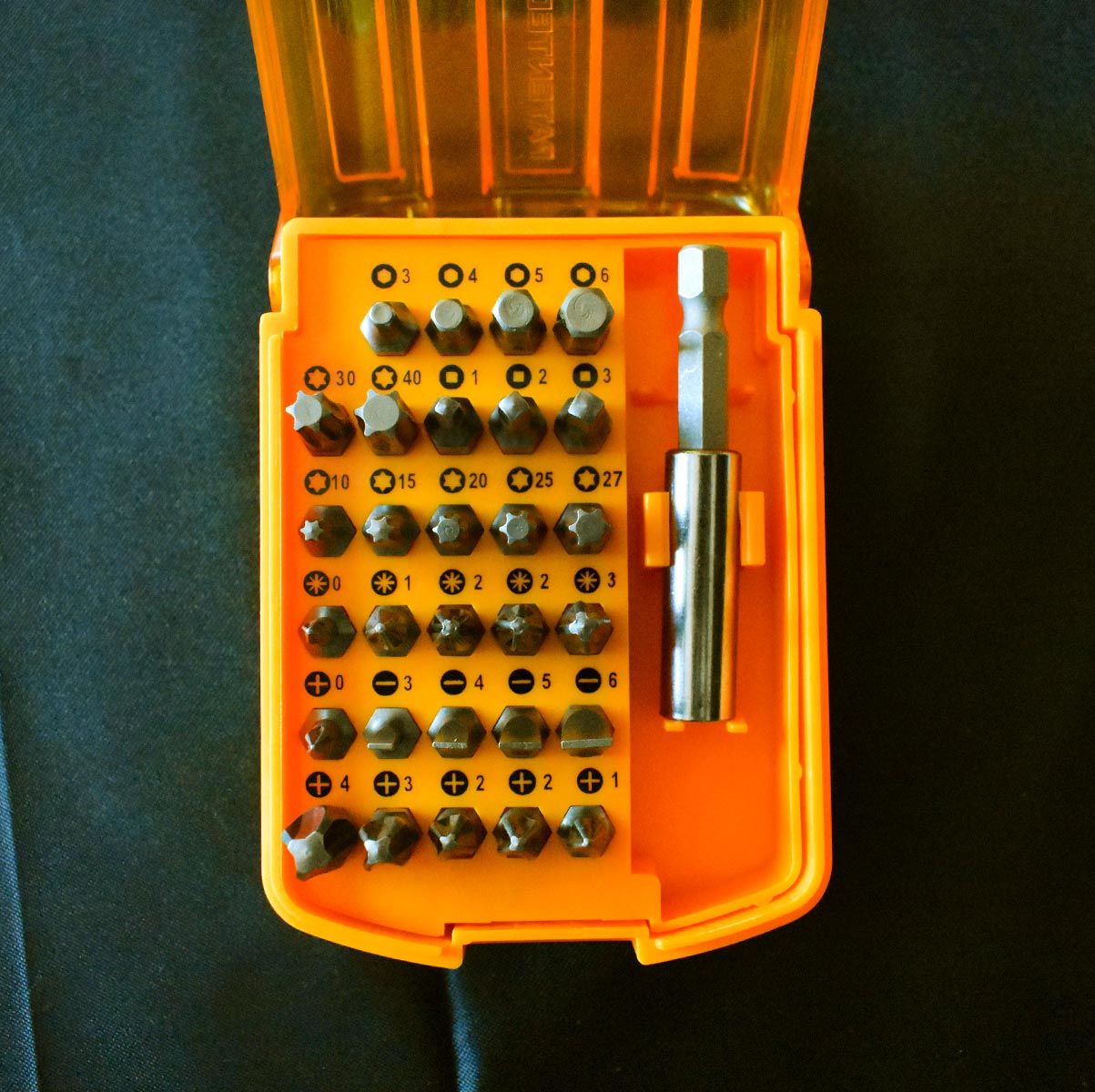 Περιεχόμενα συσκευασίας1 τεμ. Μαγνητική προέκταση 29 τεμ. Μύτες SL3, SL4, SL5, SL6 PH0, PH1, PH2, PH2, PH3, PH4 PZ0, PZ1, PZ2, PZ2, PZ3 T10, T15, T20, T25, T27, T30, T40 H3, H4, H5, H6 S1, S2, S3 Πλαστική κασετίνα (με κλιπς που μπαίνει σε ζώνη)