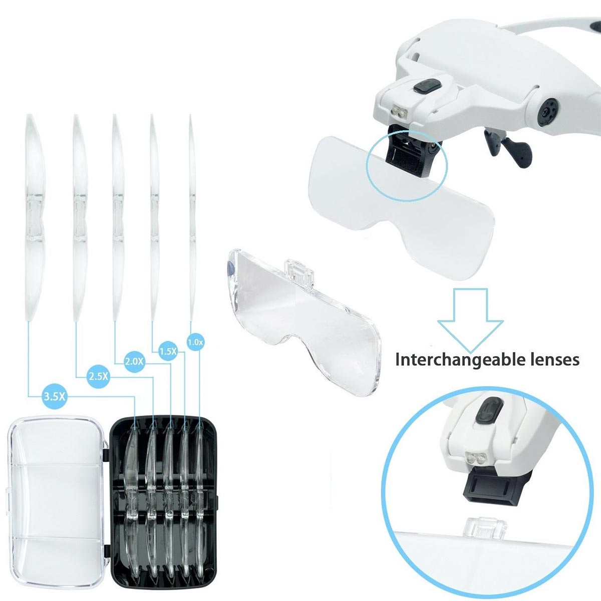 Λεπτομέρειες προϊόντοςΜεγέθυνση: 1.0X, 1.5X, 2.0X, 2.5X, 3.5X Φως: 2 Led Φ 5mm Λειτουργεί με 3 τεμ. ΑΑΑ μπαταρίες (Δεν περιλαμβάνονται)