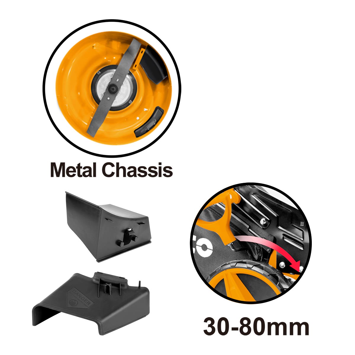 Λεπτομέρειες προϊόντοςΔιάμετρος κοπής (μαχαίρι) 18” / 460mm Ύψος κοπής 30 – 80mm Θέσεις ύψους κοπής 8 3 λειτουργίες: • Συλλογή, • Πλευρική απόρριψη, • Οπίσθια απόρριψη γρασιδιού, Χωρητικότητα κάδου 60 Lit Ατσάλινη λεπίδα Φρένο λεπίδας, Μεταλλικό πλαίσιο, Κάλυμμα μπαταρίας, * Μπορείτε να διπλώσετε την επάνω λαβή και την κάτω λαβή για να εξοικονομήσετε χώρο αποθήκευσης.