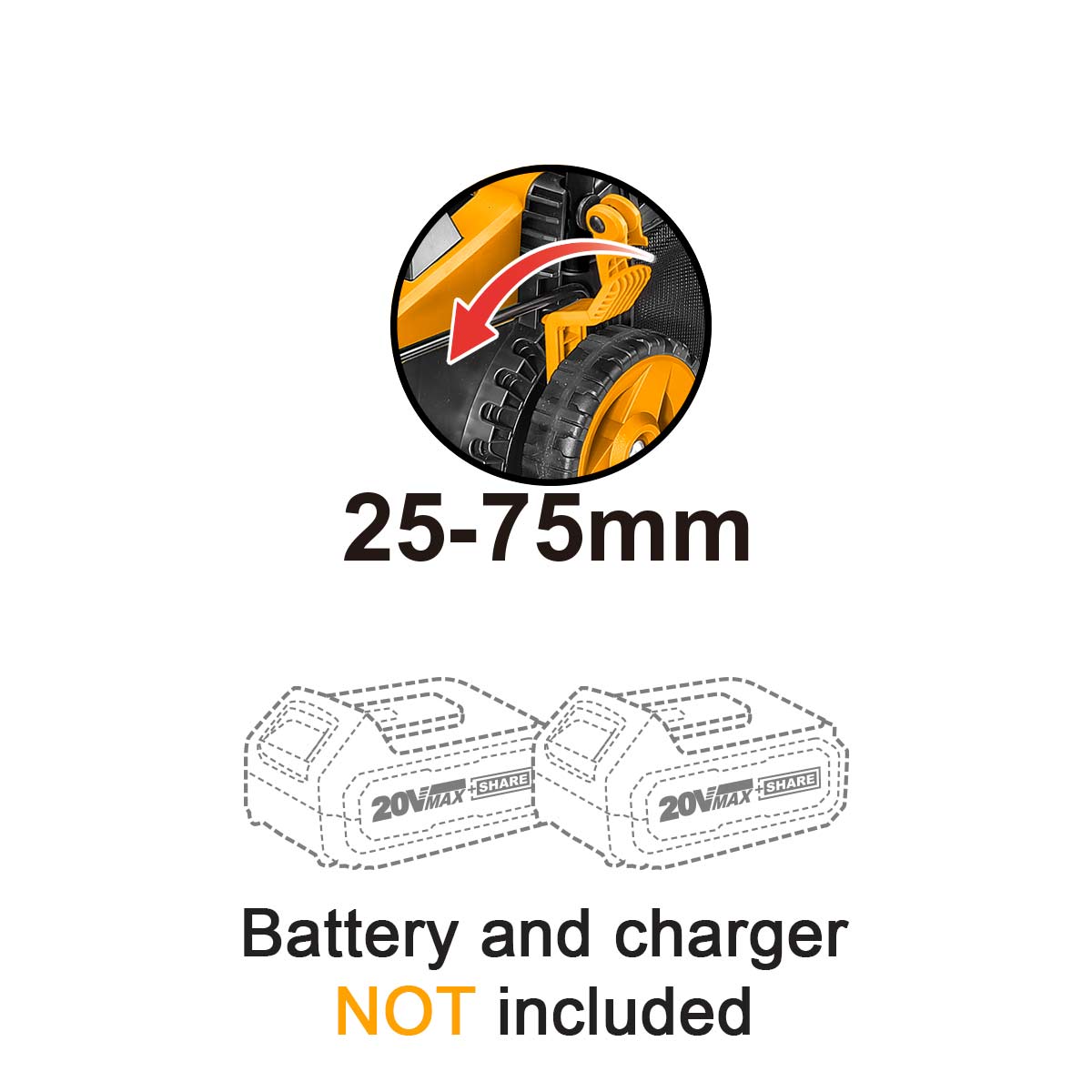 Λεπτομέρειες προϊόντοςSOLO (χωρίς μπαταρία και φορτιστή), Διάμετρος κοπής (μαχαίρι) 14” / 340mm. Ύψος κοπής 25 – 75mm. Θέσεις ύψους κοπής 6. Χωρητικότητα κάδου 30 Lit. Ατσάλινη λεπίδα, Φρένο λεπίδας, Πλαστικό πλαίσιο, Κάλυμμα μπαταρίας. * Μπορείτε να διπλώσετε την επάνω λαβή και την κάτω λαβή για να εξοικονομήσετε χώρο αποθήκευσης.
