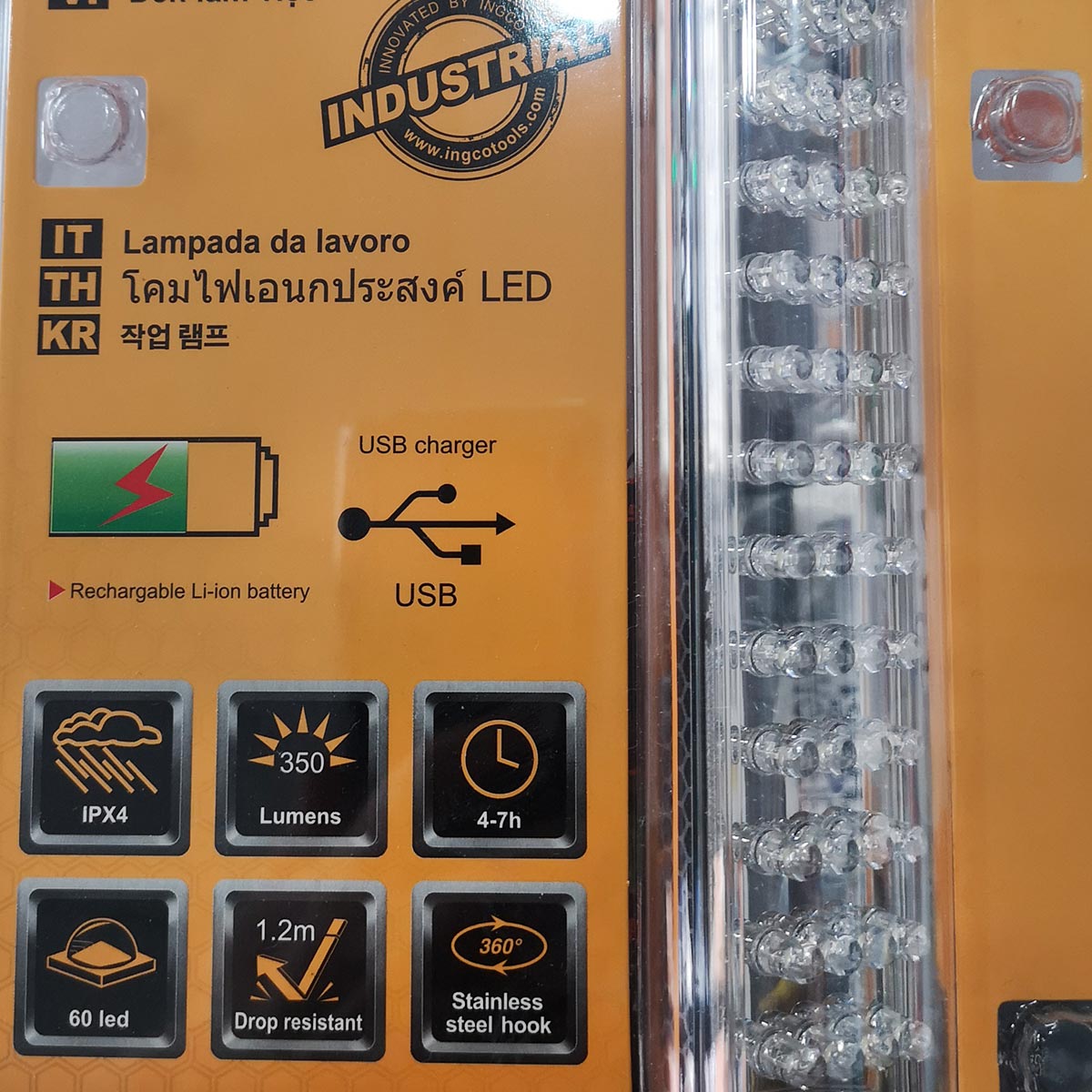 Λεπτομέρειες προϊόντος60 Led 3 θέσεις λειτουργίας: • Φωτεινή ροή (φωτεινότητα) Χαμηλή 170 lumen • Φωτεινή ροή (φωτεινότητα) Υψηλή 350 lumen • Θέση alarm Συνεχής λειτουργία 4-7 ώρες