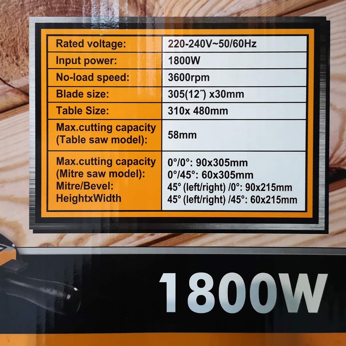 Λεπτομέρειες προϊόντοςΔυνατότητες κοπής 90 x 305mm, Μεγ. κοπή από πάνω (τραπέζι) 58mm, Φαλτσοκοπές με τράβηγμα (Radial): 0°/0° : 90 x 305mm, 0°/45° : 60 x 305mm, 45° (αριστερά – δεξιά) / 0° : 90 x 215mm, 45° (αριστερά – δεξιά) / 45° : 60 x 215mm. Φαλτσοκοπές χωρίς τράβηγμα (Radial): αριστερά 45°- δεξιά 60°. Εμπρόσθια κοπή 235mm. Εύρος κλίσης 0°- 45°. Συρόμενο 185mm. Βάση βαρέος τύπου αλουμινίου. Οδηγός κοπής με Laser. Διαστάσεις τραπεζιού 310 x 480mm.